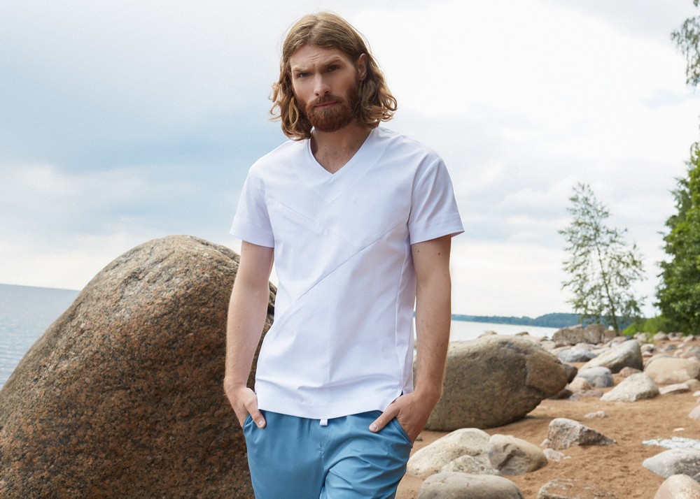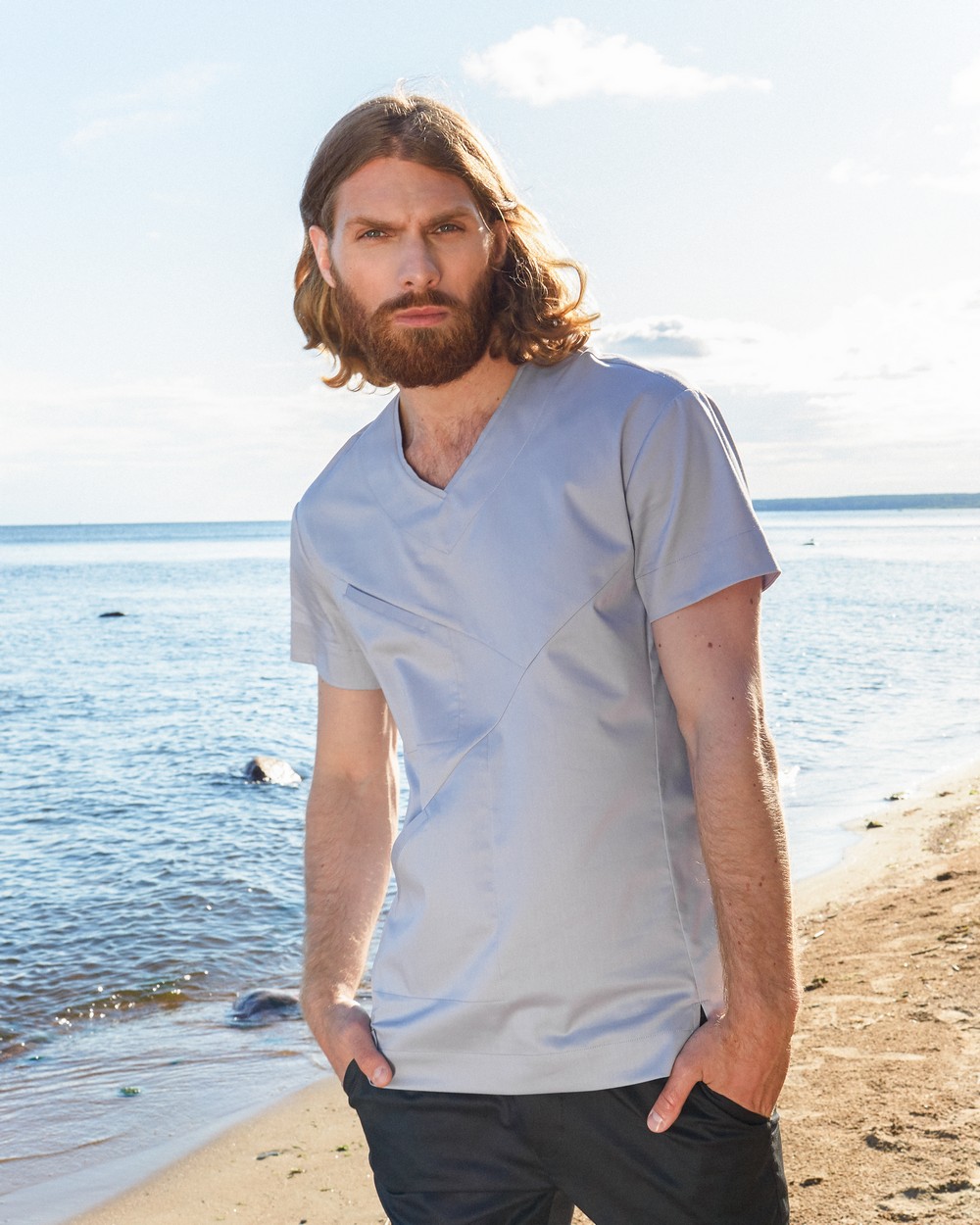 Туника полуприлегающего силуэта с V-образным воротником, отделанным подкроенными кантами. Рельефы переда один пересекает изделия полностью, другой направлен к первому и заканчивается в точке пересечения. С правой стороны переда в рельефах расположены два кармана – нагрудный и нижний. Боковые швы смещены на переднюю часть изделия и внизу заканчиваются разрезами с переходом длины на удлинение к спинке. По спинке оформлена ассиметричная отрезная кокетка с двумя входящими одна в другую линиями аналогично рельефам переда. Рукава втачные короткие.