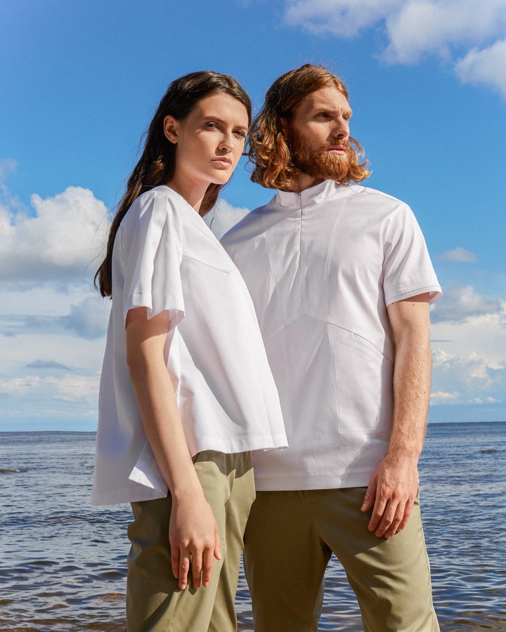 Туника полуприлегающего силуэта с ровным низом длиной до бедер или немного ниже. Воротник стойка, застежка по центру переда на потайную молнию в среднем шве идущим до пересечения с рельефами переда. Карманы по переду в швах рельефов. Рукава втачные короткие с отделкой из подкроенным кантом.